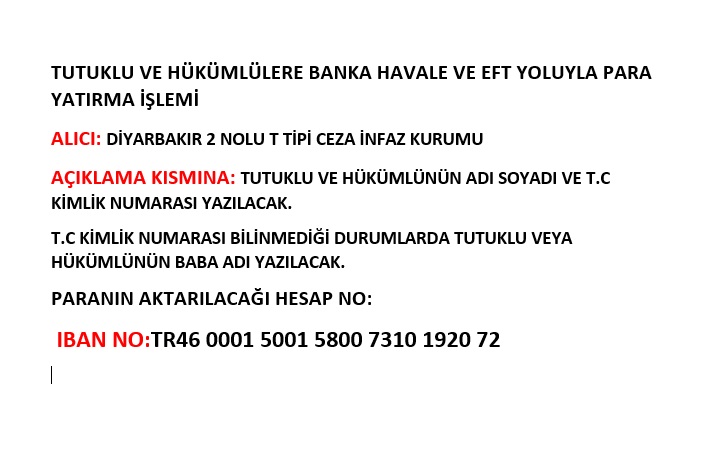 TUTUKLU VE HÜKÜMLÜLERE BANKA HAVALE VE EFT YOLUYLA PARA YATIRMA İŞLEMİ